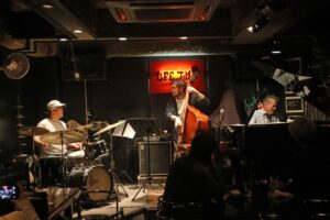宮崎市在住の宮里さんリーダーのピアノトリオに、札幌遠征から帰ってきたばかりの松崎さんをゲストに、ライフタイム50周年を記念してのライブ。