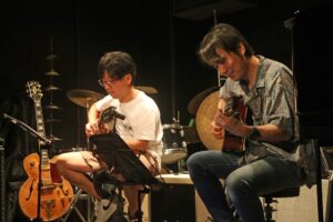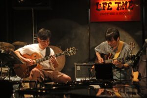 LIVE後記:9月17日:柳田裕輔[gt]/篠原一史[gt]Guitar DUO Posted on 2025年9月17日2025年9月18日 by lifetime 写真と文章:税田輝彦氏 昨夜のライフタイムライブ 篠原一史・柳田裕輔 Guitars Reunion Duo 宮崎を拠点に活動を続けている2人によるライブ。コロナ前に初めて共演して以来5年ぶりの再結成。今年2度目となるこの日、スタンダードを中心に息の合った演奏を聴かせてくれました。